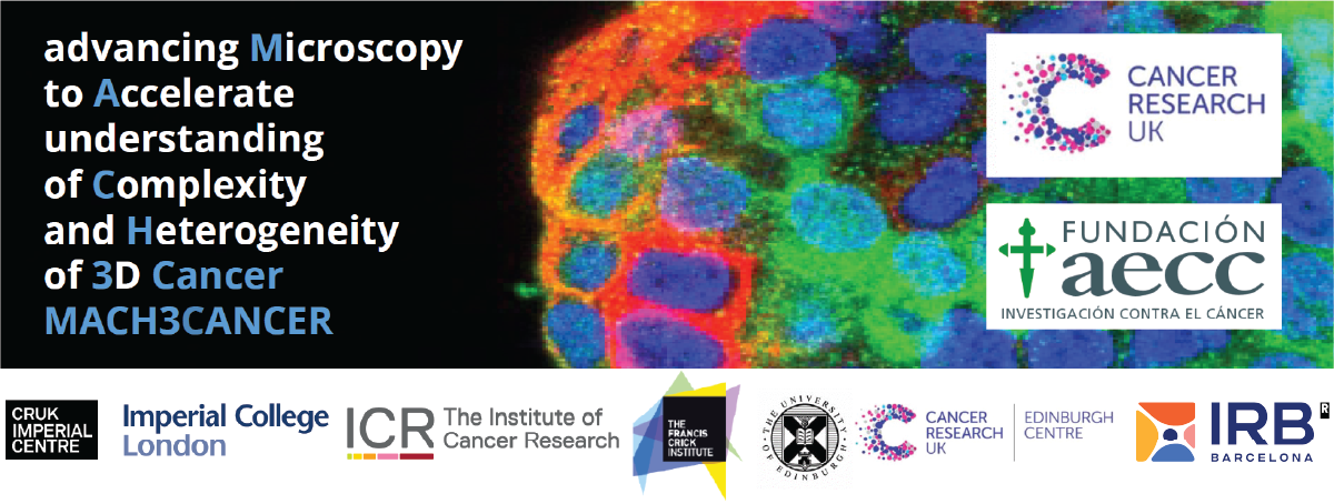 This CRUK Accelerator project aims to explore the trade-off between complexity of 3D cancer models and power of assays (in terms of single cell resolution and throughput) by developing modular, open source, automated instrumentation for rapid 3D imaging of such complex 3D cancer models and testing these instruments on a range of 3D cell cultures with different biological and optical properties. The emphasis on open source instrumentation is intended to enable other laboratories to replicate the capabilities that we develop in this Accelerator. The partners explore and optimise cell culture and sample preparation (e.g. labelling, mounting, clearing) techniques and share our know-how to enable researchers to optimise 3D assays to address their specific cancer biology questions. At IRB Barcelona, MACH3CANCER objectives are unravelled by the Batlle’s laboratory and the ADM facility. The project has brought the installation of the first OPM (Oblique Plane Microscope) in Spain.