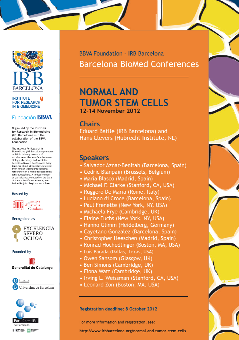 Adult stem cells are unique among somatic cells in that they are responsible for the self-renewal and repair of tissues throughout the lifespan. Over the past few years it has become increasingly evident that different types of solid and liquid tumors contain cell populations displaying stem cell features. These cancer stem cells are believed to be responsible for tumor relapse as they can efficiently initiate and regenerate the disease upon therapeutic intervention. In this meeting we will explore the latest developments in the genetic and biochemical mechanisms that regulate stem cell specification and self-renewal in normal and tumor tissues. Specific topics to be discussed include the characterization of stem cell niches, the role of stem cells in tumor initiation and the parallelisms between normal and cancer stem cells as well as their significance for tumor prognosis and therapy.