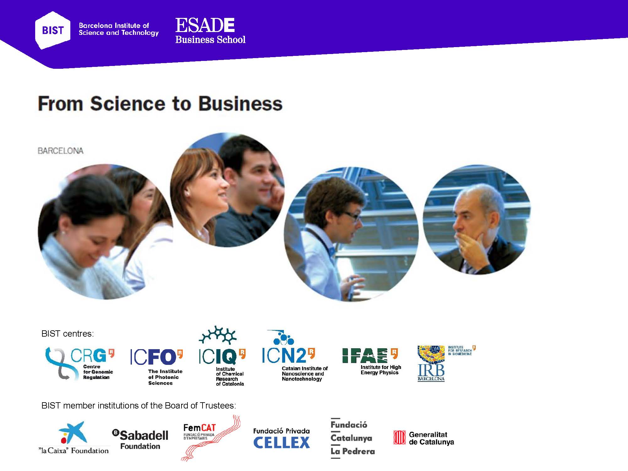 The Barcelona Institute of Science and Technology (BIST) and its participating centers are pleased to announce the organization of "From Science to Business", a 4-day intensive workshop on entrepreneurship in research, delivered in collaboration with ESADE Business School.