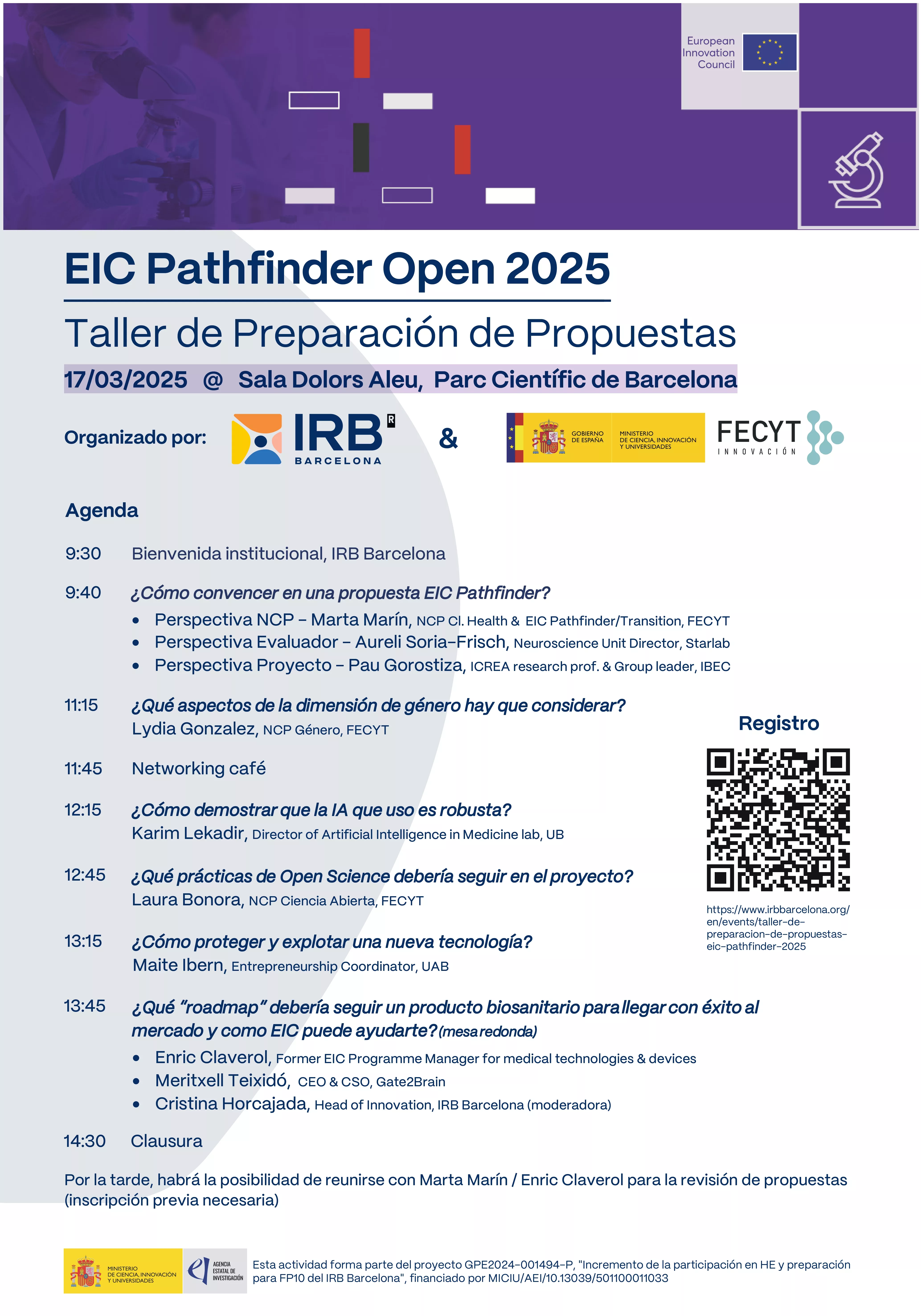 El IRB Barcelona junto con FECYT organizan un taller sobre la convocatoria EIC Pathfinder Open, dirigido a equipos de investigación interesados en obtener financiación para proyectos innovadores. El evento se llevará a cabo el 17 de marzo del 2025 en la sala Dolors Aleu del Parc Científic de Barcelona (¿como llegar?). Este taller ofrece una oportunidad única para obtener información práctica y consejo de expertos sobre la preparación de propuestas exitosas para la convocatoria de EIC Pathfinder Open del 2025.