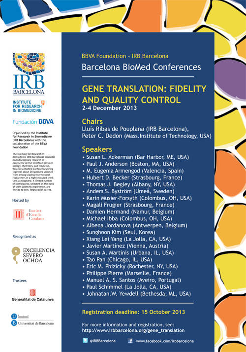 Del dilluns 2 al dimecres 4 de desembre, l’Institut d’Estudis Catalans acull la conferència “Traducció genètica: fidelitat i control de qualitat”, organitzada per l’IRB Barcelona i la Fundació BBVA.