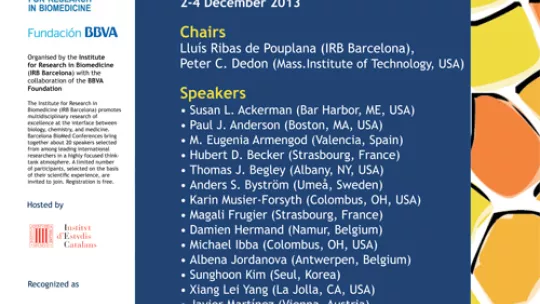 Durant tres dies, del 2 al 4 de desembre, els màxims experts en el procés cel·lular per excel·lència, la traducció de gens a proteïnes, i experts en malalties associades, es reuniran a l’IEC convocats per l’Institut de Recerca Biomèdica (IRB Barcelona) i la Fundació BBVA. Lluís Ribas de Pouplana, investigador ICREA a l’IRB Barcelona i Peter Dedon, del Massachussets Institute of Technology (MIT, Estats Units) són els coorganitzadors de la 23a Conferència Barcelona Biomed, “Gene Translation: Fidelity and Quality Control”.