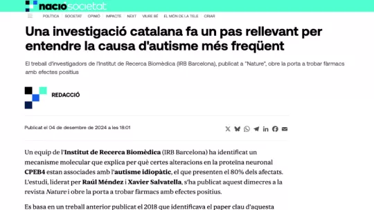 Un equip científic de l'Institut de Recerca Biomèdica (IRB Barcelona), liderat pel Dr. Raúl Méndez i el Dr. Xavier Salvatella, ha identificat un mecanisme molecular que explica perquè certes alteracions a la proteïna neuronal CPEB4 estan associades a l'autisme idiopàtic.