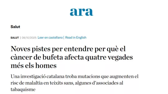 Un equip de recerca liderat per la Dra. Núria López-Bigas i el Dr. Abel González-Pérez a l'IRB Barcelona, juntament amb la Dra. Rosana Risques, a la Universitat de Washington, ha demostrat que el tabac i el sexe biològic influeixen en com evolucionen les cèl·lules normals del teixit sa de la bufeta, afavorint l'expansió d'algunes cèl·lules mutades que podrien ser determinants en el desenvolupament del càncer. El treball, que ha estat publicat a Nature, aporta noves claus per entendre per què els homes i les persones fumadores en general presenten un risc més alt de patir aquesta malaltia. La recerca es va dur a terme en part dins del projecte PROMINENT, que es desenvolupa en el marc de la prestigiosa iniciativa Cancer Grand Challenges, amb el suport de l’Associació Espanyola Contra el Càncer.