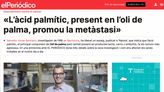 Investigadors de l'IRB Barcelona publiquen a la revista Nature un estudi sobre el mecanisme pel qual l'àcid palmític de la dieta (i no l'oleic o linolèic) afavoreix l'expansió dels tumors.