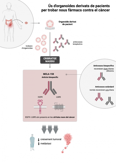 La incorporació d'organoides a les fases més inicials de la generació de fàrmacs (en aquest cas, anticossos terapèutics) permet identificar aquells que són efectius per a la majoria dels pacients o fins i tot per a tumors portadors d'una mutació en particular.