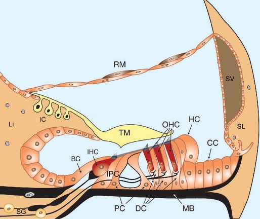 En la sordesa associada a l'edat hi ha múltiples gens i factors ambientals implicats. La patologia es manifesta clínicament com un defecte d'audició bilateral neurosensorial i progressiu, que afecta els sons d'alta freqüència i causa pèrdua de cèl·lules ciliades en l'òrgan de Corti, atròfia de l'estria vascular i degeneració de neurones del gangli espiral i de la via auditiva central.