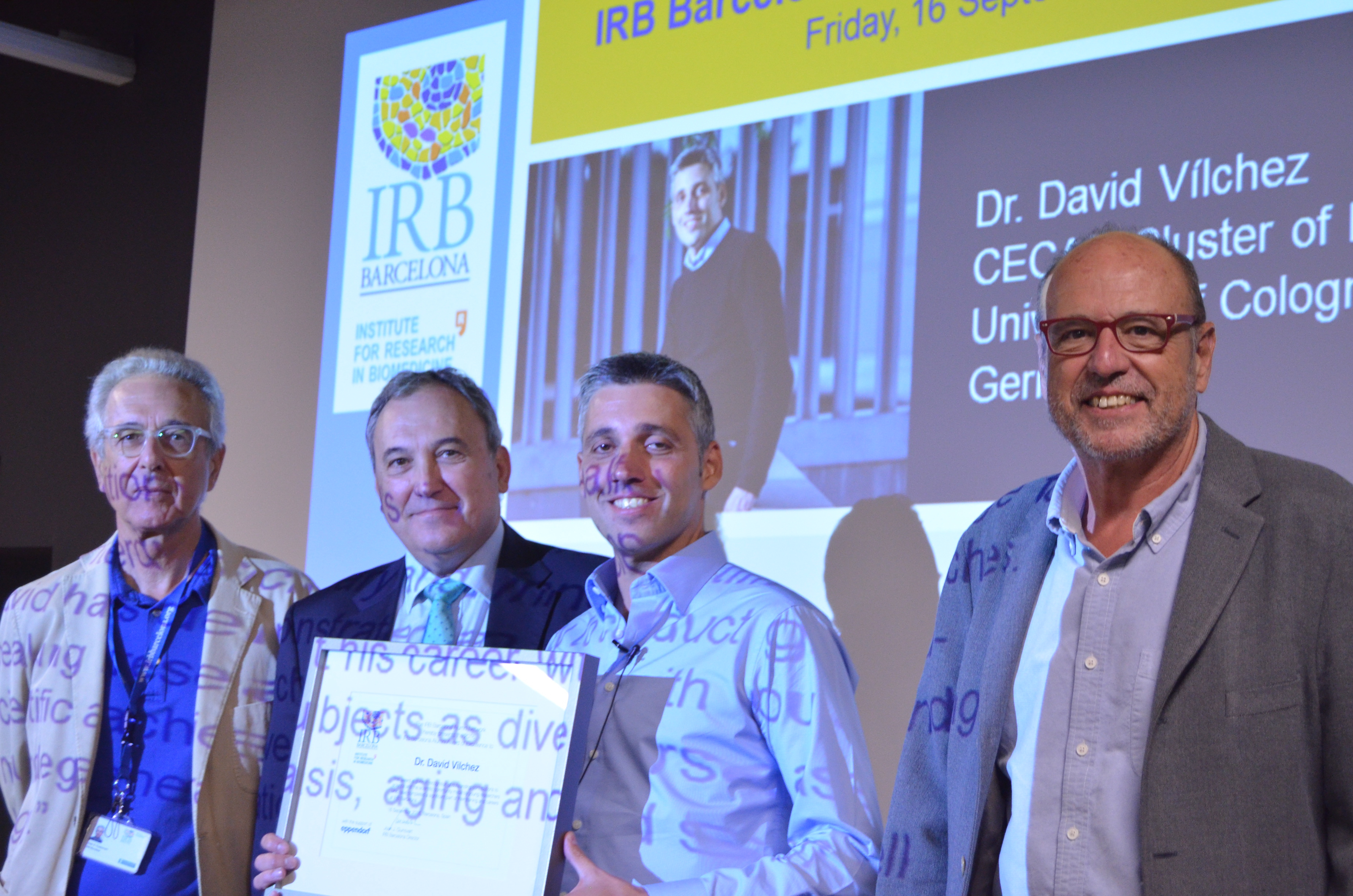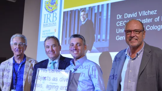 L'IRB Barcelona ha lliurat aquest divendres a David Vilchez (Mataró, Barcelona, 1978), cap de grup en el CECAD-Clúster d'Excel·lència a Colònia, Alemanya, el certificat commemoratiu que l'acredita com el primer guardonat amb el Premi Alumni a l'Excel·lència. Vilchez ha estat convidat a oferir un seminari davant la comunitat IRB Barcelona, titulat "Mimicking proteostasis of immortal stem cells in a troubled soma to extend organismal healthspan".