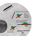 El poder inhibitori es basa en l’existència d’un complex constituït per moltes proteïnes, denominat RISC (complex de silenciament induït per RNA.) Aquest complex s’uneix a una de les cadenes d’RNA, i busca l’RNAm amb el què encaixi, s’hi enganxa i inicia la seva degradació total. Una vegada eliminat l’RNAm, el complex està lliure per buscar una nova cadena d’RNAm (veure gràfic). D’aquesta manera s’explica la gran potència d’aquest mecanisme inhibidor ja que es necessiten poques molècules d’RNA de doble cadena per destruir moltes molècules d’RNAm.