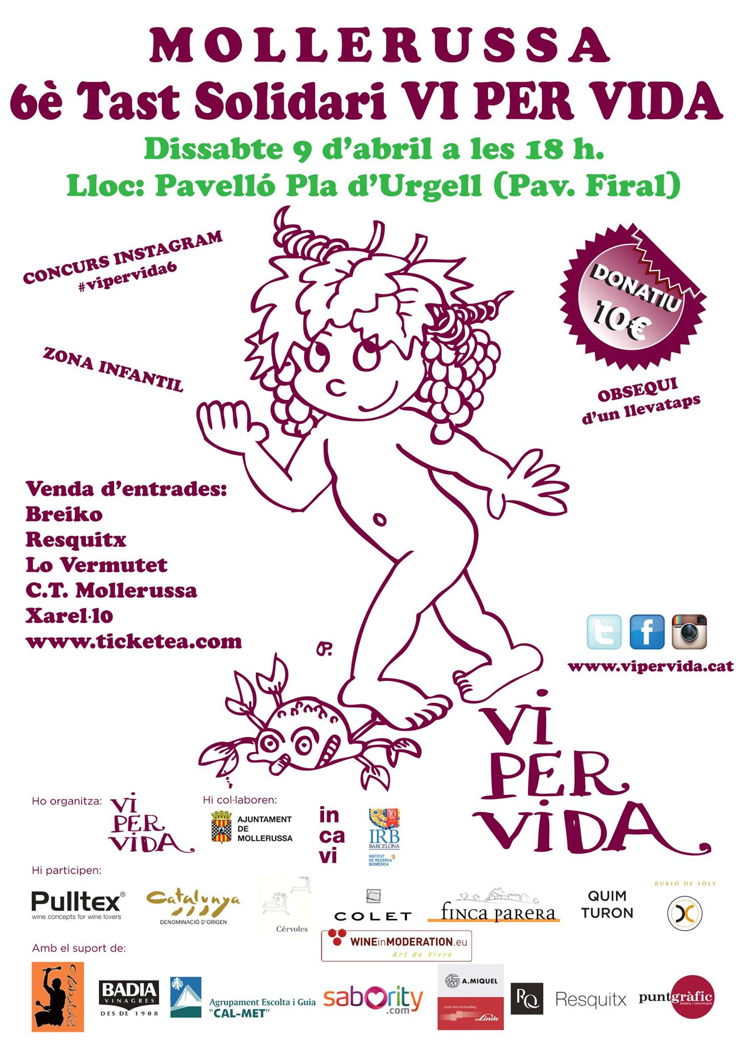 Mollerussa acollirà el dissabte 9 d’abril a les 18 hores el sisè tast de vins solidari organitzat per l’associació sense ànim de lucre Vi per Vida, impulsada per l’expert sommelier Xavier Ayala. Aquest serà el tercer tast que se celebrarà a la ciutat lleidatana i tindrà lloc al Pavelló Pla de l’Urgell (Pav. Firal) de Mollerussa. Les accions del Vi per Vida estan destinades a sensibilitzar i recaptar fons per a la recerca en càncer i metàstasi de l’Institut de Recerca Biomèdica (IRB Barcelona).