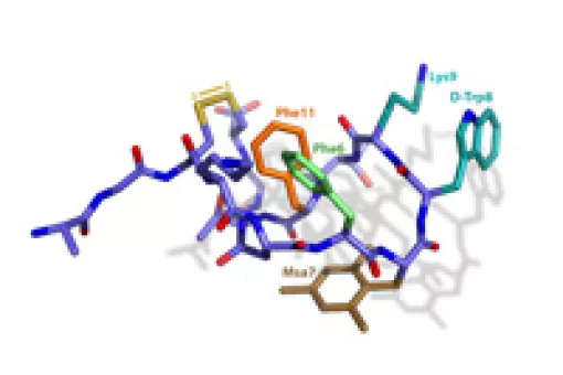 Our approach was to introduce site directed modifications into the natural sequence. We found that by fine-tuning the electronic and steric properties of specific aromatic residues (X1-X3), we could obtain peptides with high receptor selectivities and restricted conformations. Using unnatural amino acid such as L-mesityl alanine or L-3-(3’,5’-difluorophenyl)-alanine (Dfp) in positions X1-3 we developed new somatostatin analogues with improved stability and selectivity towards SSTR2.