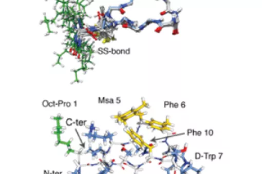 - 2.2. Hormone analogues. Back in 2011, we started a project in collaboration with BCN Peptides and Maria Macias (IRB Barcelona). The aim of the project was the synthesis of new peptide hormones with improved selectivity and stability. Somatostatin (SRIF) and Cortistatin (CST) are important peptide hormones implicated in multiple biological functions. Its broad anti-secretory profile has led SRIF-14 to clinical practice for the treatment of hypersecretory tumors and gastrointestinal disorders. CST binds to the same receptors (no specific receptor has been found) but shows distinctive anti-inflammatory and immuno-regulatory properties than SRIF. However, the potential therapeutic application of the natural hormones cannot be exploited in full, due to their short half-life in plasma.