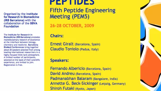 Following the spirit of previous editions of the Peptide Engineering Meeting (PEM), this Barcelona BioMed conference will gather an ensemble of scientists at the crossroads between chemistry, biology, biophysics and materials science. Researchers more from basic science, peptide design and synthesis backgrounds, will sit face-to-face with much more biomedically-oriented scientists mostly interested in the clinical uses of peptide molecules. A lot of discussion, disclosure of unpublished results, and a very iterative atmosphere will be the signature of this Barcelona BioMed conference.