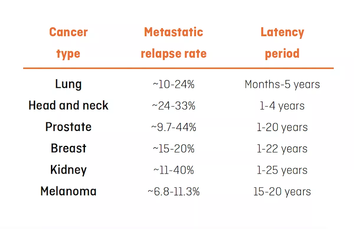The table above shows metastatic relapse rate and latency period in patients with different types of cancer. The metastatic relapse rate refers to the risk of having a relapse after removal of the primary tumour and the latency period refers to the period in which relapse can occur. Table adapted from Kim Márquez-Palencia & Malladi, Frente. Inmunol. (2019).