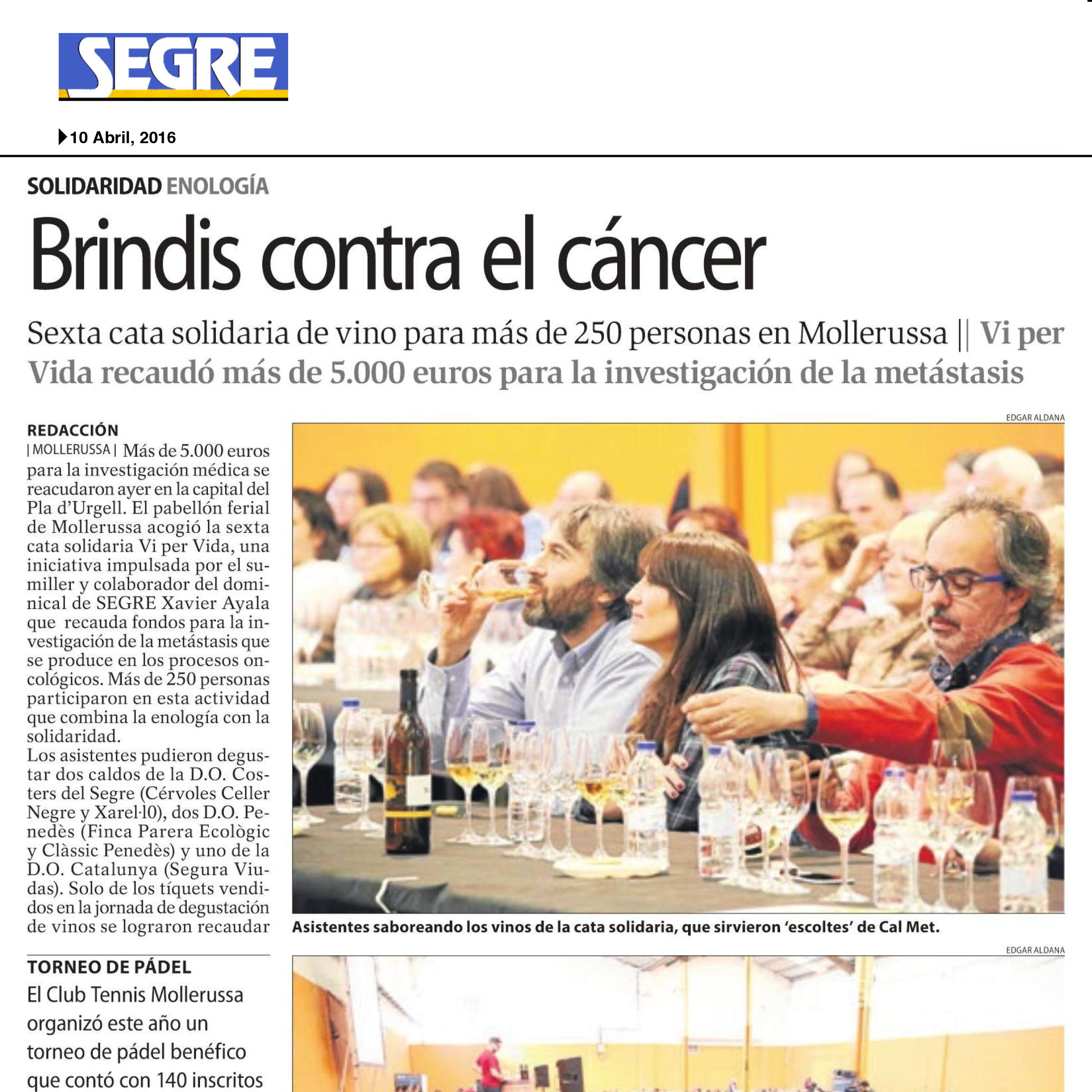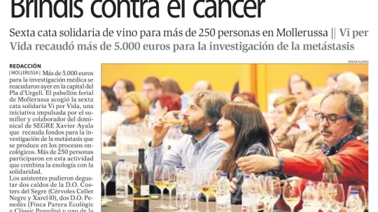 The newspaper “Segre” has published an article about the new “Vi per vida” wine tasting event, held on 9 April in Mollerussa. This charity initiative, which was launched in 2014 by the sommelier Xavier Ayala, raises funds for research into cancer metastasis at IRB Barcelona.
