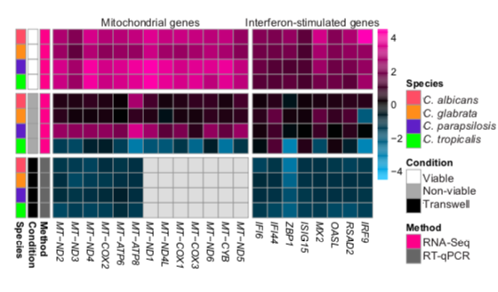 Candida pathogens induce protective mitochondria-associated type I interferon signalling and a damage-driven response in vaginal epithelial cells.