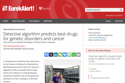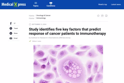 Research Programme (field_news_research_programme) All programmesAging and MetabolismCancer ScienceCore FacilitiesMechanisms of Disease Research Group (field_news_research_group) Media mentions26 Sep 2024 PocketVec: una revolución en la detección de puntos de interés farmacológico en el proteoma humano Media mentions12 Sep 2024 Medical Xpress - Study identifies five key factors that predict response of cancer patients to immunotherapy Media mentions22 Aug 2024 EurekAlert - Detective algorithm predicts best drugs for genetic disorders and cancer Media mentions18 Jun 2024 Un proyecto pionero reúne en Barcelona a oncólogos y científicos en un mismo laboratorio para acelerar la lucha contra el cáncer - El Periodico Media mentions18 Jun 2024 Éxito Rotundo en el 18º Torneo de Golf y Cena Solidaria XAP Constant - Sport Media mentions18 Jun 2024 Qué fue de los alumnos 10 de Selectividad de hace una década - El País Media mentions18 Jun 2024 New simplified DNA model for advanced computational simulations - PHYS Media mentions18 Jun 2024 Eduard Batlle, 30 años resolviendo los misterios del cáncer colorrectal - La Vanguardia Media mentions18 Jun 2024 Joan Josep Guinovart, Diploma de Honor de la Confederación de Sociedades Científicas - La Vanguardia Pagination First page First Previous page < Page 1 Page 2 Current page 3 Page 4 Page 5 Page 6 Page 7 Page 8 Page 9 … Next page > Last page Last