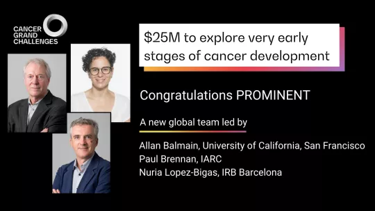 Announced on 16 June 2022, the Cancer Grand Challenges PROMINENT team is taking on the initiative’s Normal Phenotypes challenge. It is led by Professor Allan Balmain (University of California, San Francisco), Dr. Paul Brennan (WHO International Agency for Research on Cancer, France), and Dr. Nuria Lopez-Bigas (Institute for Research in Biomedicine, Spain), along with six co-investigators and two patient advocates, and involves five institutions across the US, Spain and France: Duke University; Institute for Research in Biomedicine; International Agency for Research on Cancer; Stanford Medicine; and University of California, San Francisco. The Cancer Grand Challenges PROMINENT team is funded by Cancer Research UK, the National Cancer Institute, part of the US National Institutes of Health, and the Asociación Española Contra el Cáncer, Spain.