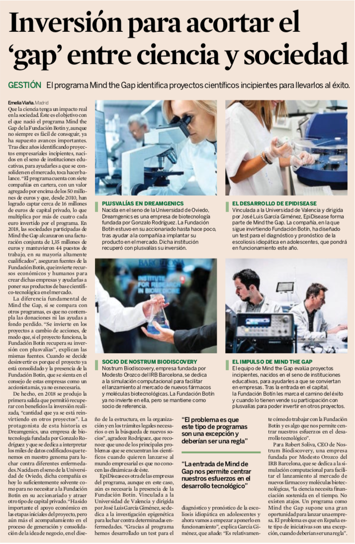 Nostrum Biodiscovery, a company founded by Modesto Orozco, head of the Molecular Modelling and Bioinformatics Lab at IRB Barcelona, features in an article published by Expansión and devoted to the Botín Foundation’s "Mind the Gap" Programme.