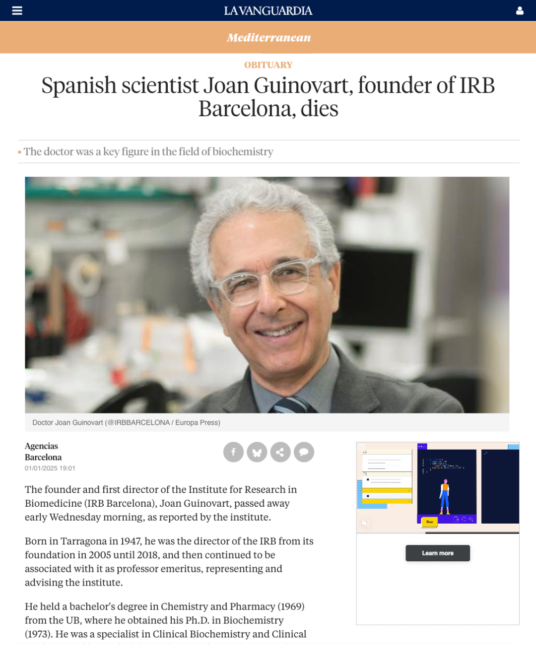 La Vanguardia - Spanish scientist Joan Guinovart, founder of IRB Barcelona, dies