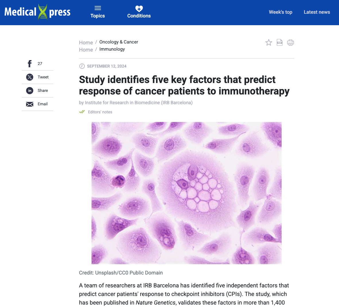 Medical Xpress - Study identifies five key factors that predict response of cancer patients to immunotherapy