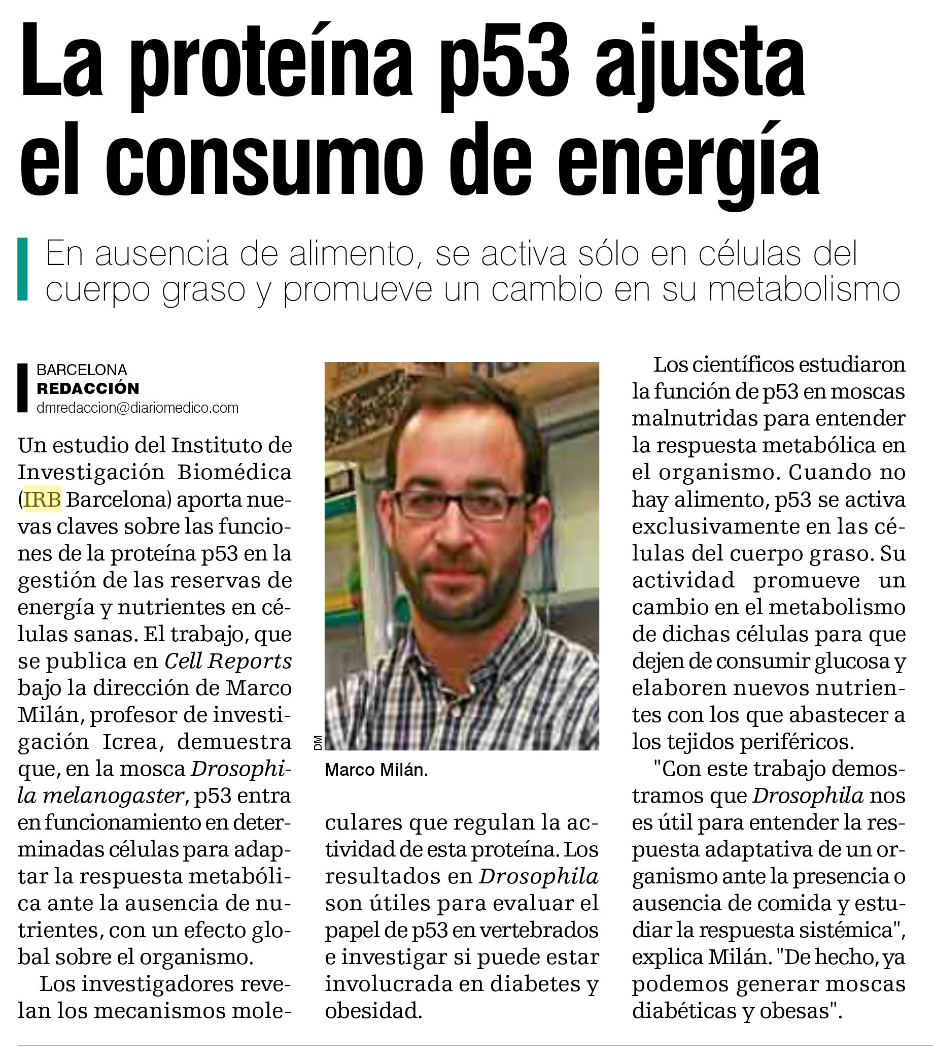 Diario Médico echoes on an article about nutrition developed by Lara Barrio and Marco Milán in the Development and Growth Control laboratory. The work was published in Cell Reports.