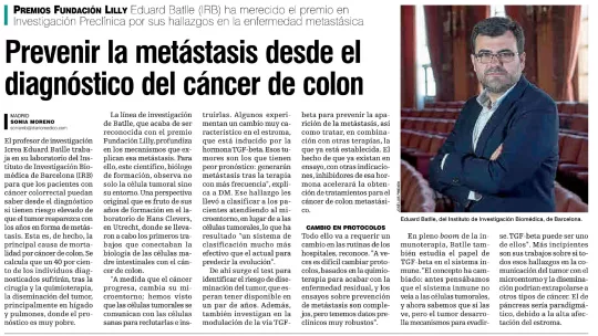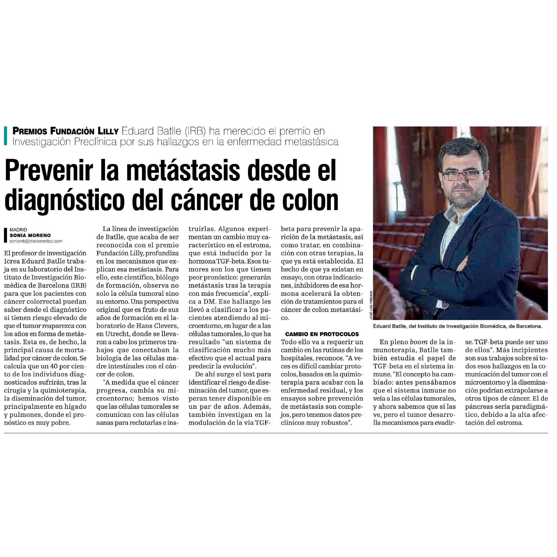 “Diario Médico” devoted an article to Eduard Batlle, ICREA researcher and group leader of the Colorectal Cancer Laboratory, who received the Lilly Foundation Preclinical Research Award last Tuesday for his research on colon cancer.