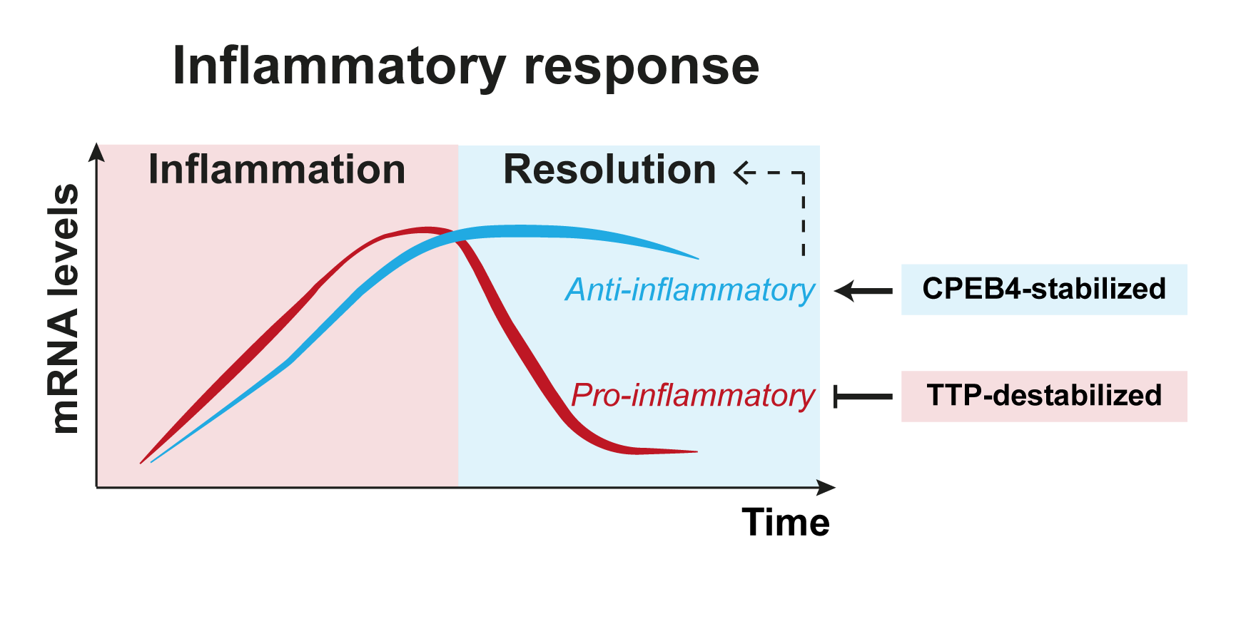 The mechanism proposed is based on a balance between two elements, namely the pro-inflammatory TTP protein, and CPEB4 protein, the latter being essential to terminate inflammation.