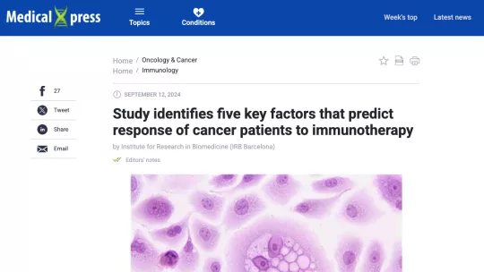 - A team of researchers at IRB Barcelona has identified five independent factors that predict cancer patients' response to checkpoint inhibitors (CPIs).