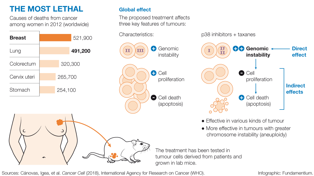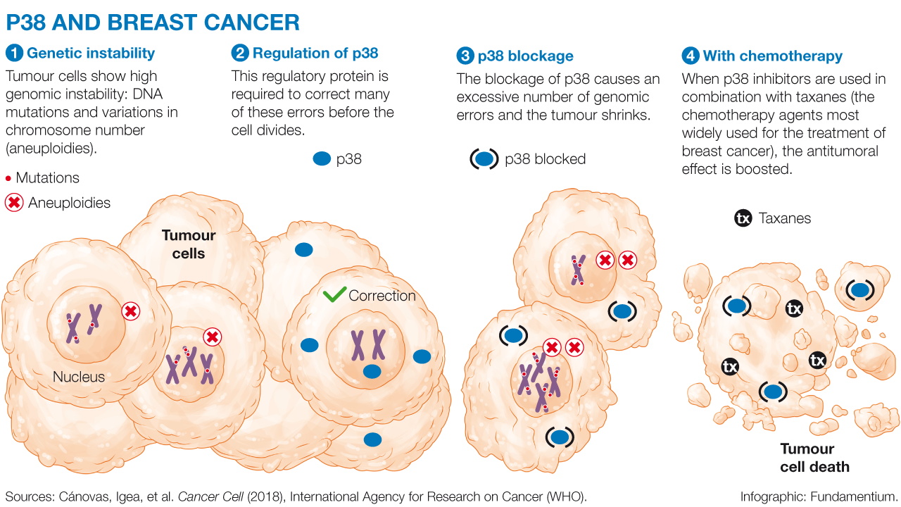 The researchers used p38 inhibitors to block the action of this protein in tumour cells. These inhibitors have already been used in clinical assays involving patients, but for other diseases. In this study, p38 inhibitors were combined with classical chemotherapeutic drugs called taxanes, such as paclitaxel and docetaxel. As expected, the cells treated with combined therapy showed greater accumulation of genomic instability, that is to say, they carried more DNA damage and a greater number of chromosome variations. Consequently, many of these cells died and the tumour mass shrank considerably.
