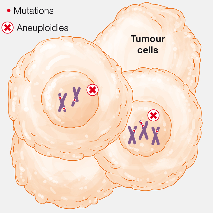 Tumour cells show high genomic instability: DNA mutations and variations in chromosome number (aneuploidies).