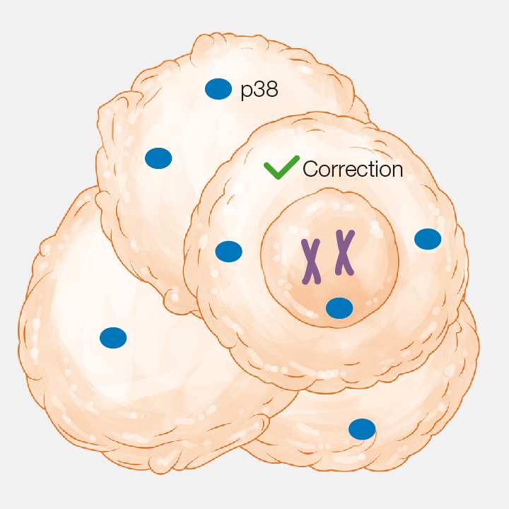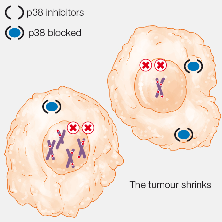 The blockage of p38 causes an excessive number of genomic errors and the tumour shrinks.