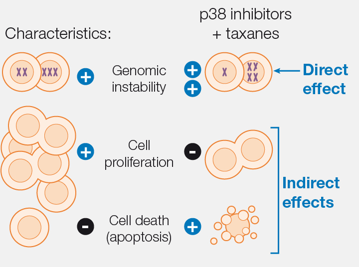 When p38 inhibitors are used in combination with taxanes (the chemotherapy agents most widely used for the treatment of breast cancer), the antitumoral effect is boosted.