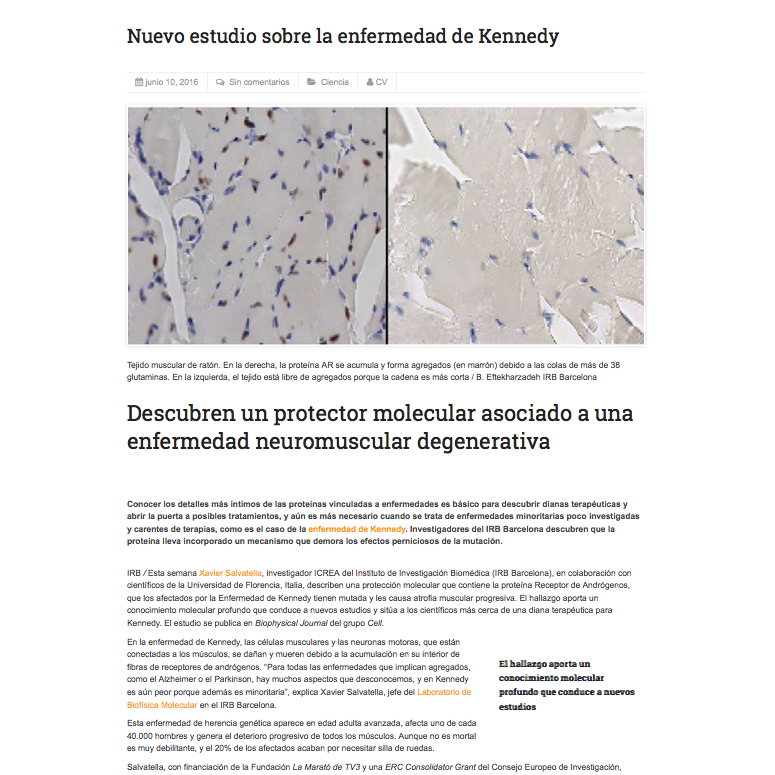 Various media outlets have reported on the findings on Kennedy's disease of Xavier Salvatella's group, ICREA researcher and leader of the Laboratory of Molecular Biophysics. The study was published in the Biophysical Journal, part of the Cell group.