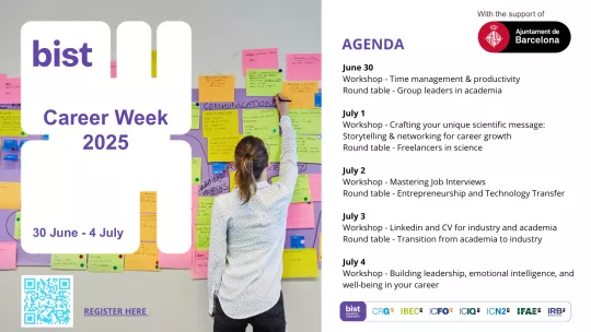 The BIST Career Week is an event organized by BIST in collaboration with the seven research centres (CRG, IBEC, ICFO, ICIQ, ICN2, IFAE, IRB Barcelona), to provide our scientific community an overview of the skills needed to take their careers to where they want to, and also to show them a glimpse of several professional sectors.