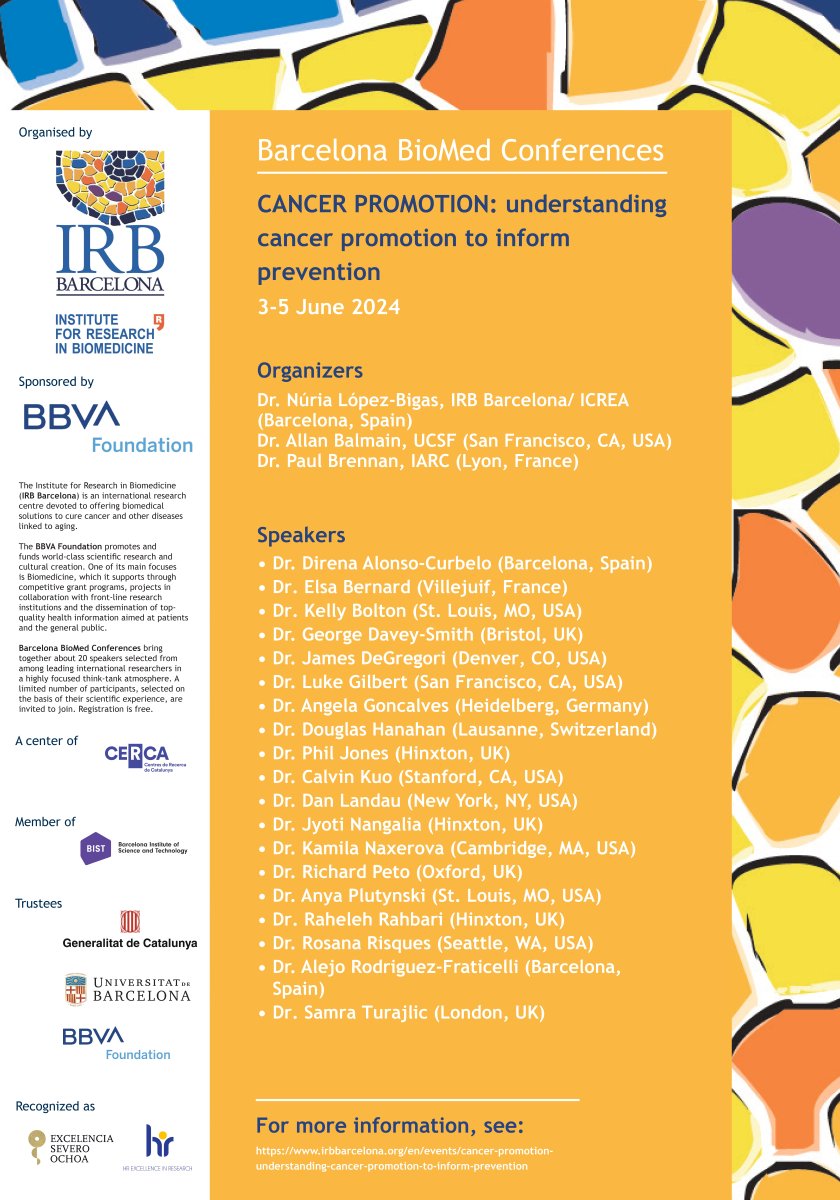 This 41st edition of Biomed conference will provide an interdisciplinary forum for researchers interested in the principles of cancer promotion and in their implications for understanding tumor initiation and informed prevention. The conference will also showcase novel technologies to study clonal expansion in human normal tissues, promotion studies in organoids and model systems, and functional screens to reveal the mechanisms of promotion.