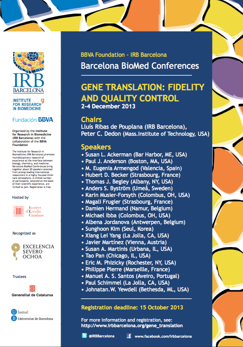 The BARCELONA BIOMED CONFERENCE on GENE TRANSLATION: FIDELITY AND QUALITY CONTROL will be hosted by the Institut d'Estudis Catalans (IEC) in the heart of downtown Barcelona. Talks will take place in the Sala Prat de Riba.