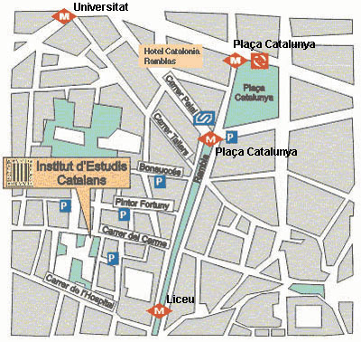 Transfer to the metro Red Line (L1), and get off at laça Catalunya. The IEC is a 10-minute walk from the Plaça Catalunya (see map).
