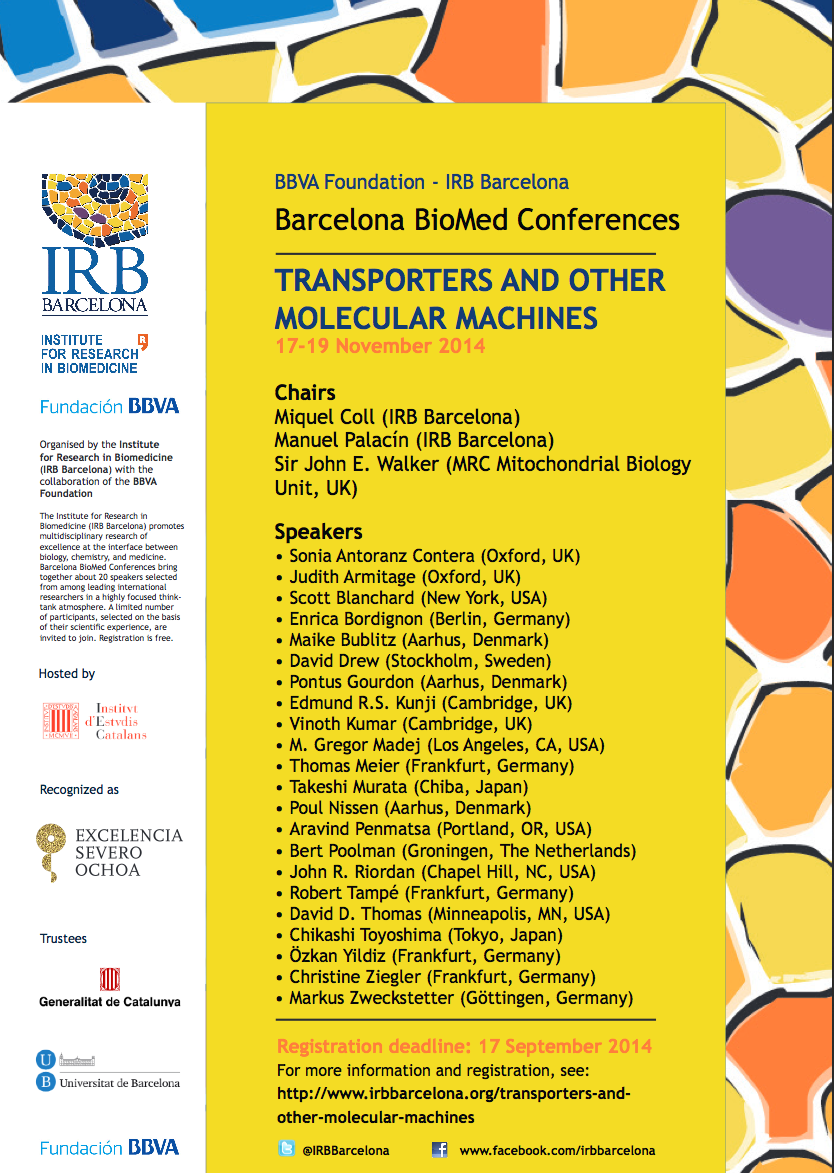 The BARCELONA BIOMED CONFERENCE on Transporters and other Molecular Machines will be hosted by the Institut d'Estudis Catalans (IEC) in the heart of downtown Barcelona. Talks will take place in the Sala Prat de Riba.
