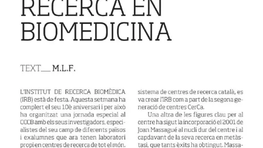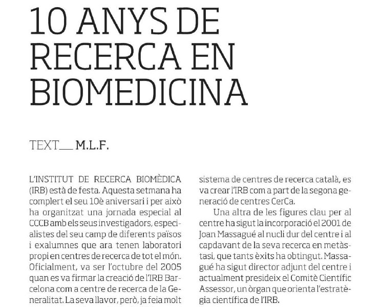 El diario ARA al igual que muchos otros medios hna informado sobre los 10 años del IRB Barcelona. En un artículo el pasado domingo en ARA hacen un repaso de los éxitos del centro alcanzados en una década.