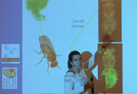 Los estudiantes de doctorado, Elisabeth Castellanos y Ana Janic, del laboratorio de Cayetano González, presentaron sus últimos proyectos de investigación sobre el cáncer con la mosca de la fruta (Drosophila). Los participantes pudieron aprender los mecanismos de división de las células de Drosophila, y entender lo que pasa cuando fallan, provocando que las células proliferen sin control, produciendo finalmente un cáncer.