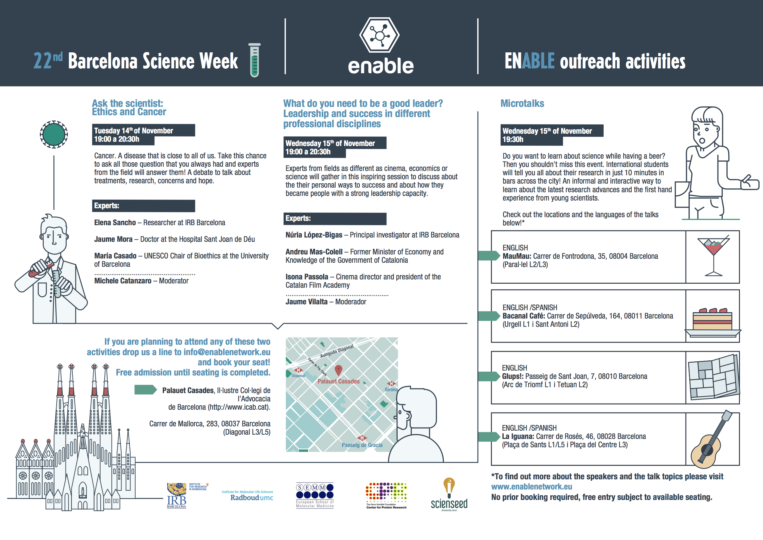 Uno de los objetivos de ENABLE es establecer un diálogo activo con la sociedad. Coincidiendo con la Semana de la Ciencia en Cataluña, la organización local de ENABLE, formada por estudiantes de doctorado del IRB Barcelona, ha programado múltiples actividades de divulgación en Barcelona, concentradas en los días 14 y 15 de noviembre.