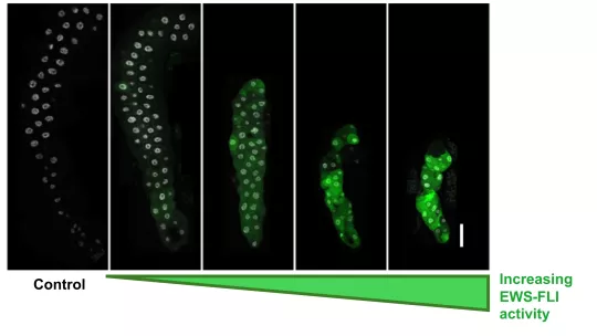 En este nuevo estudio, a través de estrategias innovadoras, el equipo de investigación afrontó este desafío y logró generar una serie de modelos de moscas que expresan EWS-FLI en diferentes niveles, lo que aportó una herramienta matizada para estudiar los efectos del oncogén.