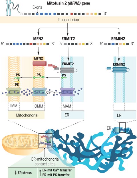 Un equipo de investigación dirigido por el Dr. Antonio Zorzano, del IRB Barcelona, y la Universidad de Barcelona, el Dr. Luca Scorrano, del VIMM y la Universidad de Padua, y la Dra. Deborah Naón, miembro de ambos equipos, ha revelado la existencia de distintas "variantes" de la proteína Mitofusina 2, denominadas ERMIT2 y ERMIN2. Estas variantes se generan a través del “splicing alternativo”, un proceso en el que segmentos del gen denominados "exones" se reorganizan para generar proteínas diferentes a partir de la misma secuencia de ADN. Sorprendentemente, ERMIN2 y ERMIT2, derivadas de la proteína mitocondrial Mitofusina 2, no se localizan en las propias mitocondrias, sino en el retículo endoplásmico.