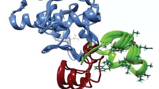 Vídeo: Cambio tridimensional de la proteína SMAD2 desde la conformación abierta que permite la unión de este factor transcripcional al ADN (en verde) a la forma cerrada incompatible con dicha unión (en rojo). Pau Martín-Malpartida y Maria J. Macias, IRB Barcelona.