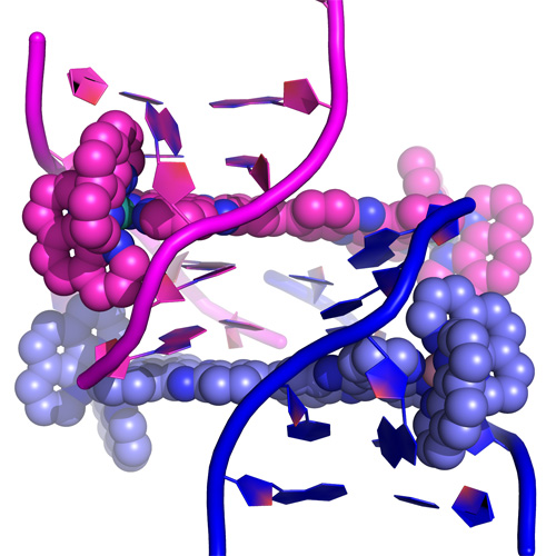 La molécula tiene dos núcleos de rutenio, uno en cada extremo, y es capaz de atravesar dos cadenas de ADN -dos dobles hélices cercanas-, y engancharlas. “No es como un intercalador clásico que se apila entre las bases o peldaños del ADN.