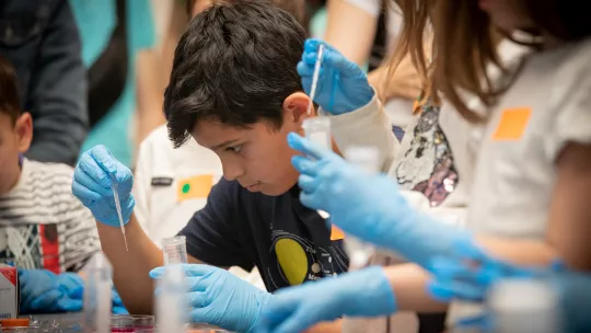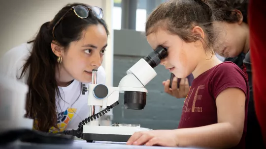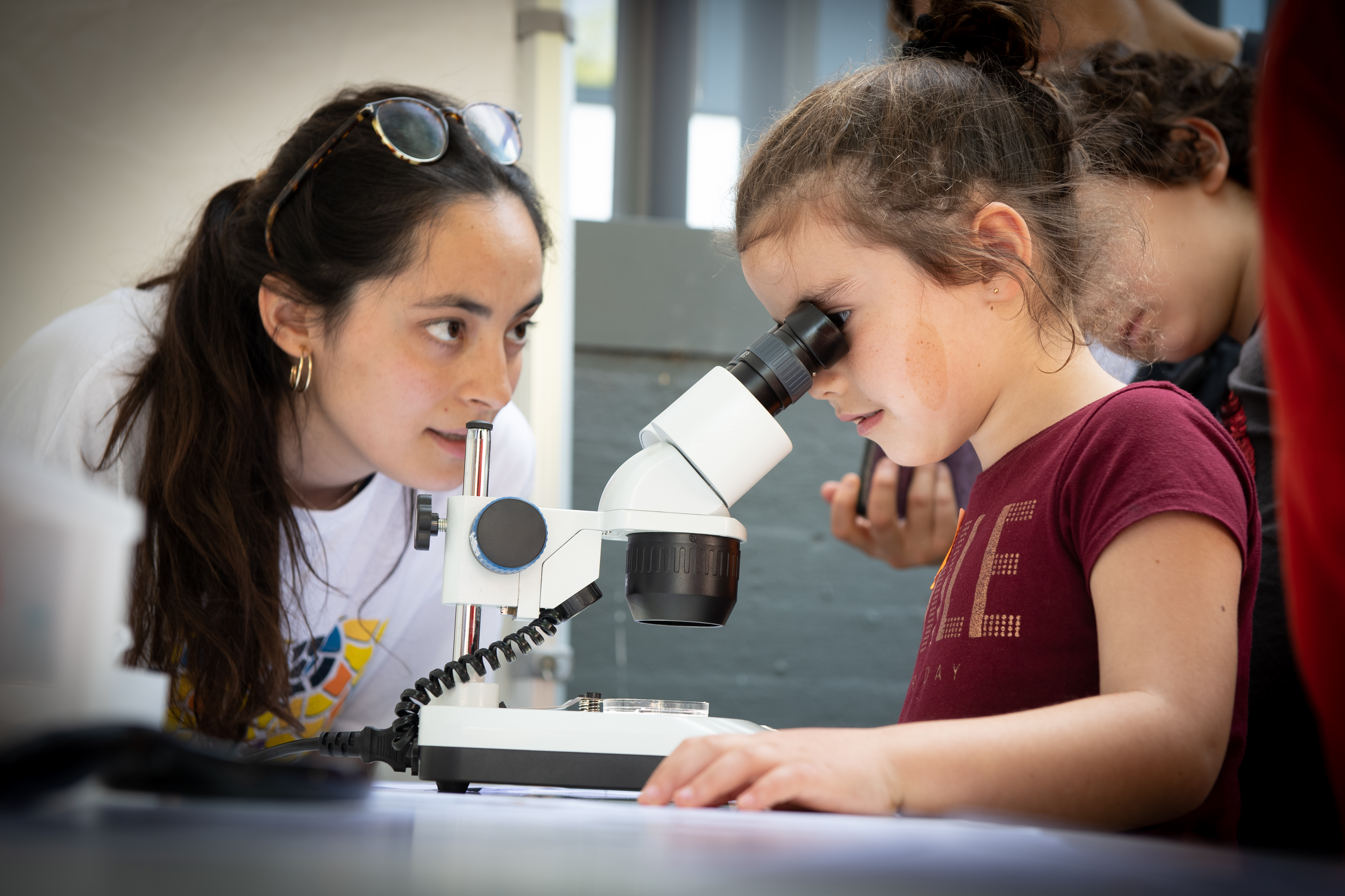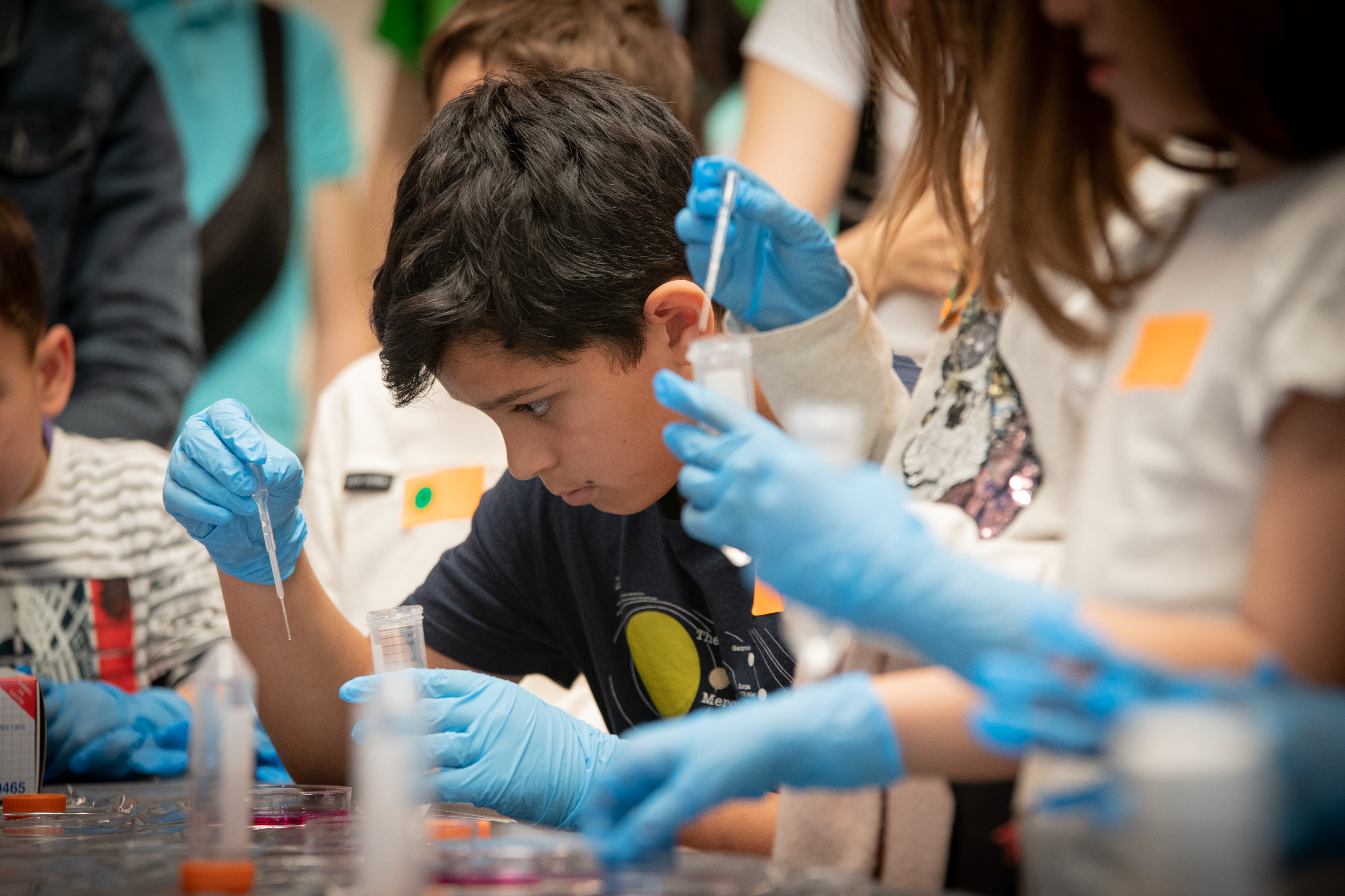 Adornadas con globos de colores, varias carpas de la feria científica estuvieron dedicadas a las mentes de los más pequeños, desafiándoles a completar múltiples actividades y descubrir la ciencia. Y no solo eso: el público también tuvo la oportunidad de descubrir cómo investigar con la mosca Drosophila, observar células en un microscopio, y extraer ADN de la fruta.