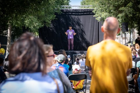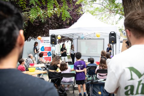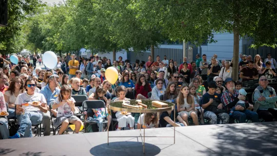 El equilibrio de las actividades de divulgación para todas las edades también se mostró en el escenario. A media mañana hubo un divertido espectáculo científico a cargo de Big Van Ciencia: un monólogo conducido por dos jóvenes científicos con una clara vocación de comunicar la ciencia. Pronto se ocuparon las 80 sillas qie había frente al escenario, pero muchas más personas pudieron observar y reír bajo la sombra de los árboles, acompañadas por el ruido de fondo de un puesto cercano de globos inflados con helio para el público más pequeño.