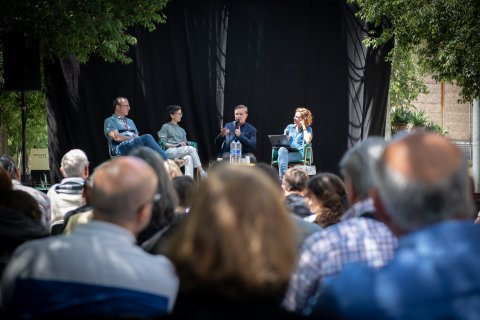 La siguiente actividad en el escenario, con el consiguiente cambio de público, fue una mesa redonda que abordó la temática de “El uso de la inteligencia artificial en biomedicina”. Presidida por Cristina Sáez, periodista científica del diario La Vanguardia, también contó con la participación del Dr. Patrick Aloy (IRB Barcelona), la Dra. Begoña Román (Universidad de Barcelona) y Dr. Esteve Almirall (ESADE Business School). Los rostros de las personas asistentes reflejaban una inmersión total en el debate.