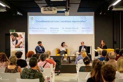 Para añadir una dimensión más al encuentro con el público, la mañana incluyó una mesa redonda sobre "Envejecimiento celular y medicina regenerativa" para un público adulto. Moderada por la periodista científica Núria Jar, que contó con la participación del Dr. Manuel Serrano, jefe del laboratorio de Plasticidad Celular y Enfermedad del IRB Barcelona, el Dr. Ramon Estruch, líder del grupo de Riesgo Cardiovascular, Nutrición y Envejecimiento del IDIBAPS, y Mercedes, paciente de cáncer de pulmón. Los asistentes aprendieron sobre los factores que se pueden modificar, es decir, la dieta, la actividad física y los medicamentos, y fueron alertados sobre el hecho de que la "edad" es el factor de riesgo más relevante para el desarrollo de enfermedades. De hecho, en el ámbito de la investigación, se considera cada vez más que las enfermedades son el resultado de un proceso de envejecimiento acelerado en un órgano concreto. Se hizo una mención especial al potencial emergente de la inmunoterapia para curar el cáncer en algunos pacientes.